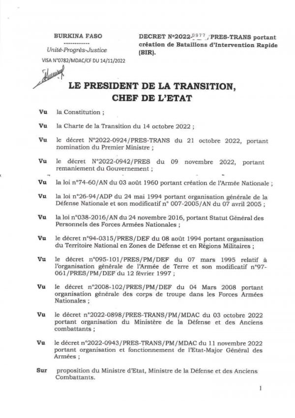 En rappel, en août et septembre derniers, le Président déchu, Paul Sandaogo avait signé des décrets portant création de 3 bataillons d’intervention rapide. Le présent décret qui abroge les précédents, porte donc le nombre des BIR à 6.